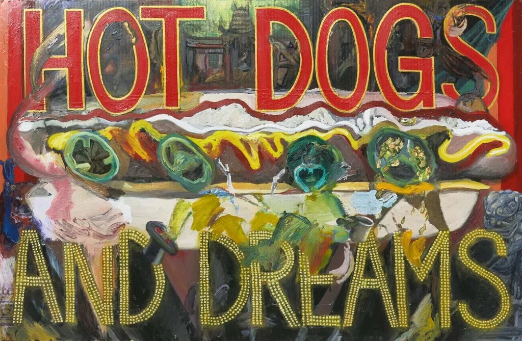 I was three quarters of the way through the painting when I got a call telling me the Hot Dogs and Dreams had been shut down by the LA County Department of Public Health. I was about to destroy the painting in a frustrated rage but instead I decided to finish it. The absurdity of painting a Hot Dog sign for a Hot Dog stand that no longer existed when I should have been looking for another job seemed appropriately symbolic of where I was at with my art and life in general.